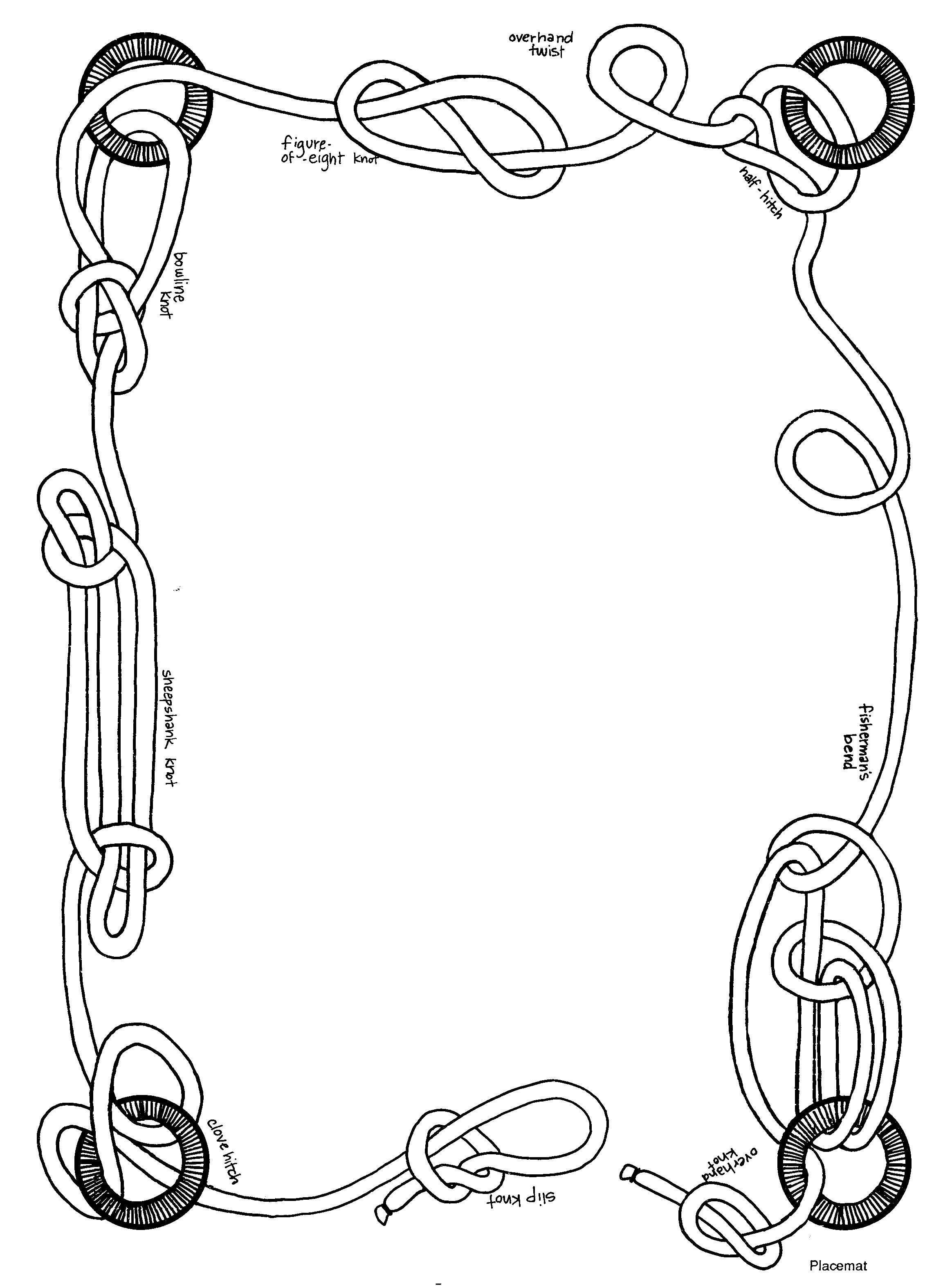 With knot tying and ropes being such an important part of the Scouting program we could “KNOT” resisit choosing this theme for a Blue and Gold Banquet. The invitation and invitation insert should be photocopied on cardstock (we suggest blue or gold). Cut out invitation along rope edges following dotted lines where indicated. A slit should then be cut from dotted line to short mark (approx. 1 /2 inch). This enables the lassos to interlock when folded as shown. Invitation insert should be cut in a rectangle very close to rope edge. This is attached to inside of invitation between fold marks. We suggest using a glue stick. Place marker – After photocopying the place marker on card stock, punch holes as indicated and fill in name. An 18″ length of small rope or heavy twine is inserted through the holes and tied with an inexpensive ring. This place marker is intended to be used by each guest in conjunction with the placemat on p. 18. The placemat(large rope border) should be enlarged to 11 X 17 and photocopied for individual placemats. These could be colored by either boys or leader. As guests arrive and are seated they can practice the knots shown on the placemats using the rope and ring from their place marker. If you would like to provide a handout the boys have made in den meeting, or a favor made at the banquet, we suggest a knot bracelet made from twine or heavy yarn. You will need three or four lengths 18 inches long. These are tied with overhand knots at intervals of approx. 1-1/2 inches. (See rope bracelet example) Form a circle big enough to slip over your hand and tie off trimming ends to be even. We suggest that you create an actual rope teaser puzzle with a large rope. This could be set up in a designated area with a sign that says “How many knots will be in this rope when the two ends are pulled tight.” (Answer is one). During the evening, two Cub Scouts could be chosen to pull the ends and demonstrate. This teaser could be photocopied and given to each participant. Other rope tricks could also be performed. Table decorations could be made by the boys by wrapping soup or juice cans closely with rope to create vases for flowers. A large rope with knots at intervals could serve as a table runner. Napkin rings could be made from rope (in the same manner as the bracelet.) Optional words “Scout Banquet” are provided.