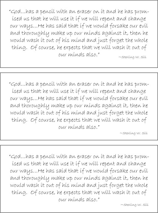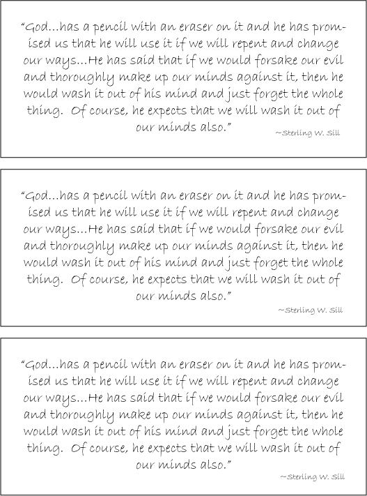 This handout was submitted by a user and has the following quote from the lesson by Sterling W. Sill: “God… has a pencil with an eraser on it and he has promised us that he will use it if we will repent and change our ways…He has said that if we would forsake our evil and thoroughly make up our minds against it, then he would wash it out of his mind and just forget the whole thing. Of course, he expects that we will wash it out of our minds also.”