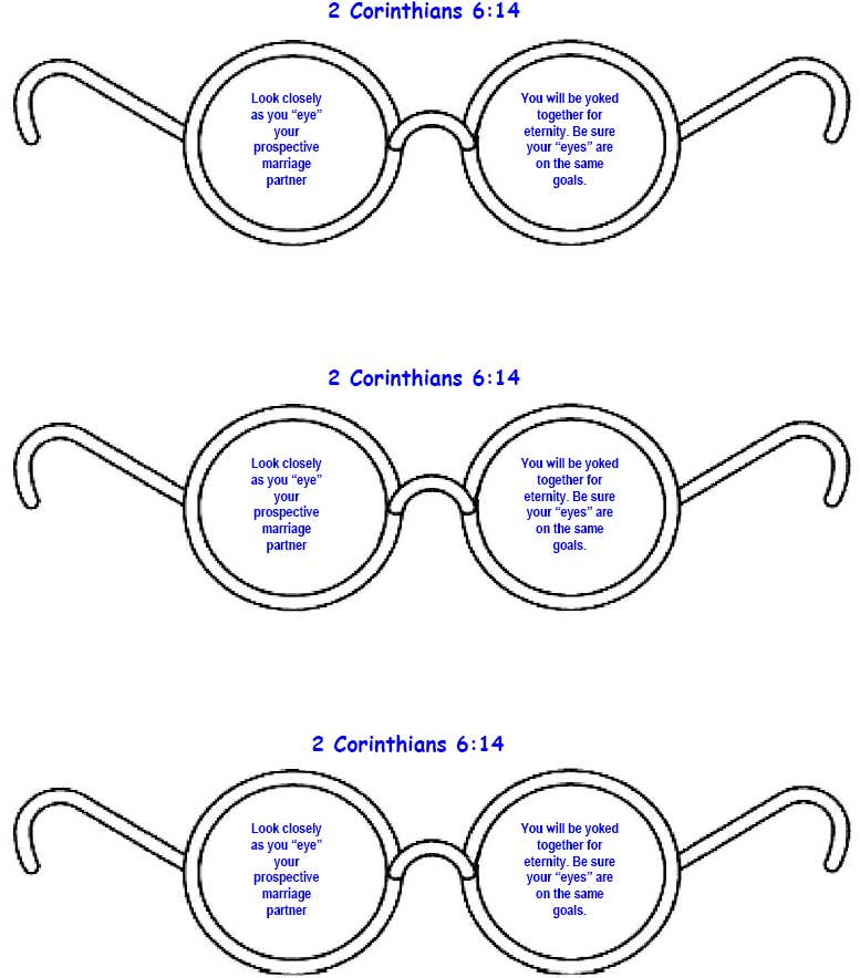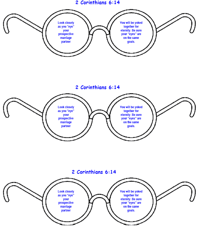 This cute handout was submitted by D. Burke. It has the handout from the lesson — rimmed spectacles with text on the lenses that says “Look closely as you eye your prospective marriage partner. You will be yoked together for eternity. Be sure you have your eyes on the same goals.” along with the scripture reference 2 Corinthians 6:14.