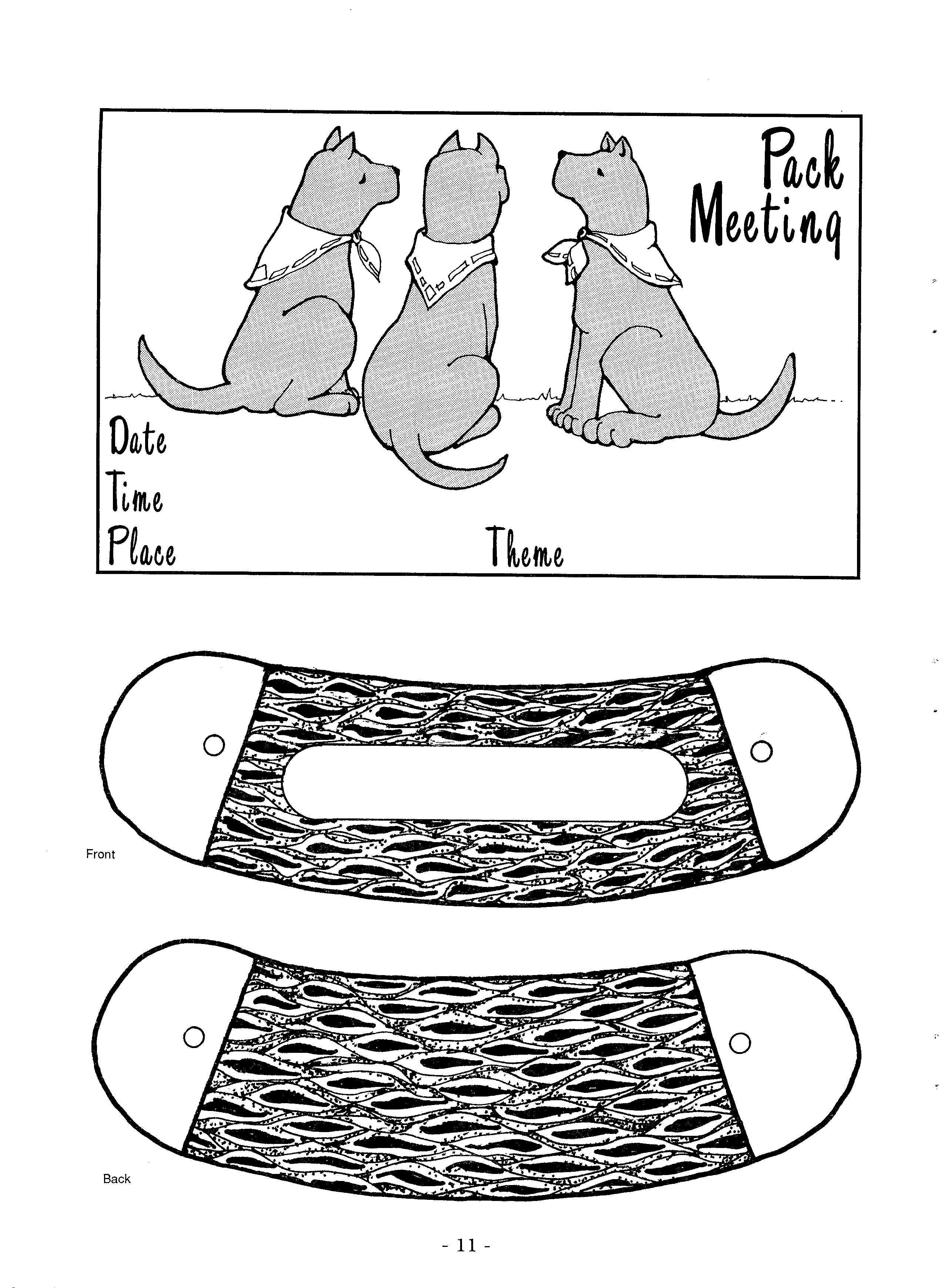 1) The Wolfgraphics should be photocopied and filled in with pertinent information. It could also be enlarged to poster size and laminated. This permanent poster could be displayed in a prominent location the week before pack meeting and serve as a familiar reminder of the upcoming meeting. Date, time, place, and theme could be filled in with grease pencil or written on strips of masking tape (colored if desired) or paper strips which could then be changed each month.