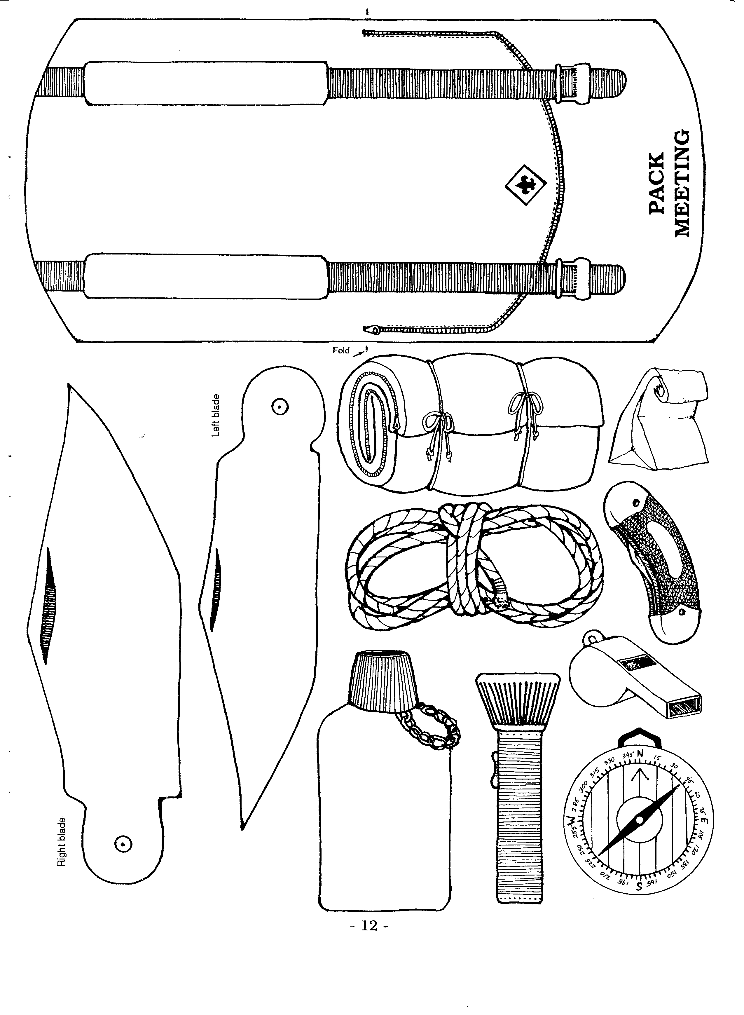 3) Back Pack – For an invitation, the back pack needs to be photocopied and cut out. With an exacto knife carefully cut out around the flap zipper, cutting through the straps for a continuous line. Fold in half and glue around edges. Place information on or under the inside of flap. The small graphics, (canteen, knife, compass, sleeping bag, lunch, flashlight, rope) fit Inside the finished pack. These could be labeled with information for an activity. Another suggestion is to challenge boys to earn the pack and its contents by passing off certain requirements, for a goal, attendance, dues, uniforms, or as incentive for other troop or pack