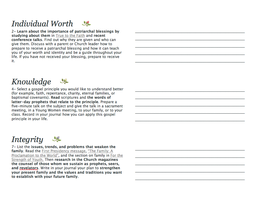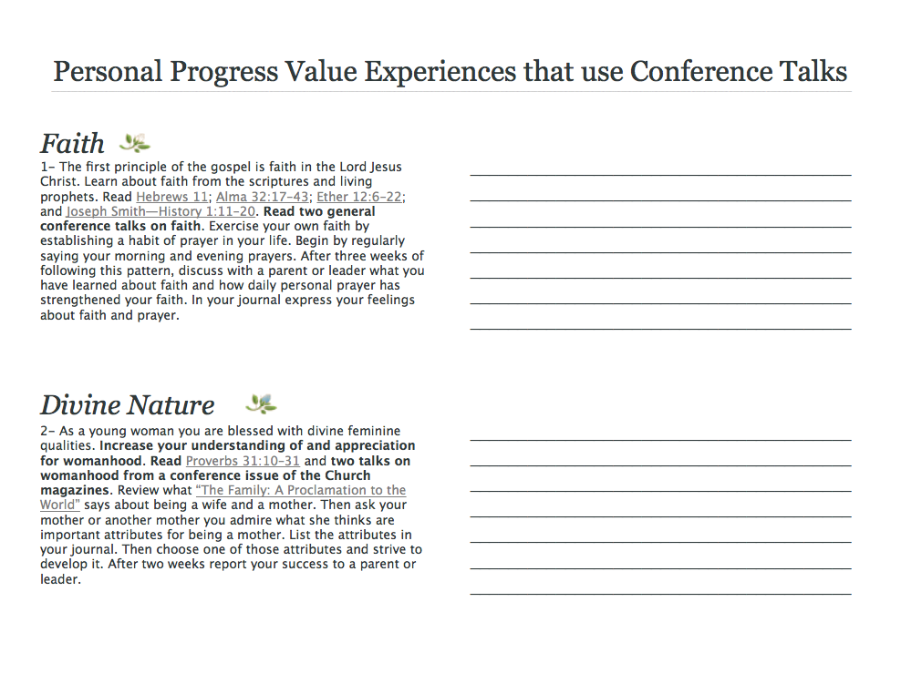 Print off for Young Women to use as they watch General Conference. The bolded words in each experience are what young women should focus on and look for as they listen to the General Conference talks. The right column is for writing the talk title, who gave it, and for taking notes.