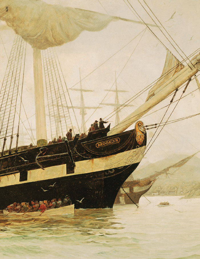 Not all the Saints moved west in covered wagons or handcarts. A group of 238 Saints sailed from New York City in 1846. Their voyage took them around the tip of South America to San Francisco, California. This trip, aboard the ship Brooklyn, took about six months. They arrived in California a year before the first pioneers arrived in the Salt Lake Valley. Some of these Saints stayed in California and helped build up San Francisco and other communities; others later went on to the Salt Lake Valley.