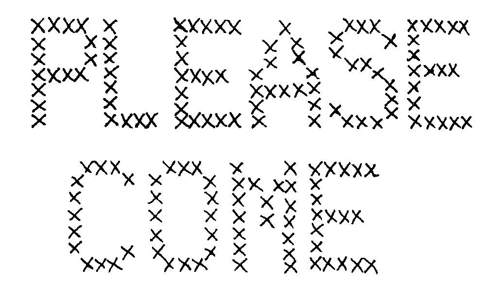 This black and white image, Please Come Cross Stitch, was donated by the artist, Chris Gunn. Click to read more about Chris.