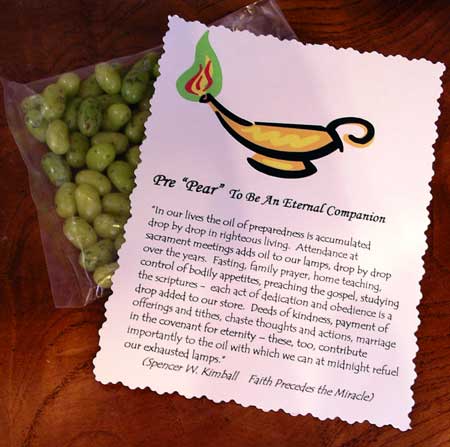 This cute handout was made by another Young Women’s leader. It has a quote from Spencer W Kimball, a clipart image of a lamp, and a small bag of pear-flavored jelly beans.