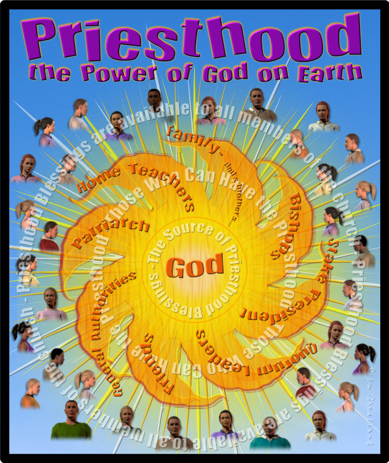 This is another handout from Trudy, meant to accompany YW Manual 2 Lesson 12: The Blessings of the Priesthood. It has a brightly colored sun-like image with curved rays with the list of priesthood offices from the lesson. It also has a variety of male and female busts sourrounding the image, illustrating that the Priesthood brings God’s power to all of us.