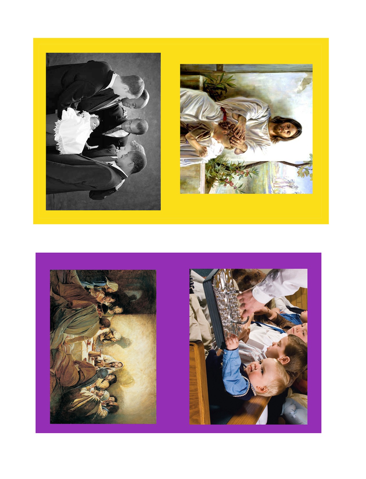 Shared by Debbie S: Here’s an activity I made for Primary 3, Lesson 9 – “Priesthood Blessings & Ordinances”. It’s a memory game. One piece of the match is what Jesus did, and the corresponding piece is the ordinance as we do it today. I made a matching colored border around the pictures to help the children identify which ones go together. (My class is 4-year-olds)