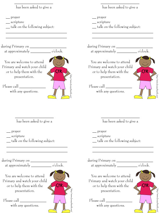This has a reminder form that can be sent home with Primary children assigned prayers, scriptures, or talks.
