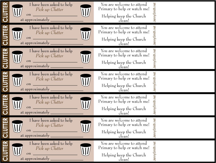 This is a handout based on the Primary Assignment Wristbands created for a user. In her Primary, children are assigned weekly to help pick up after church is over. Sounds like a great idea to me!
