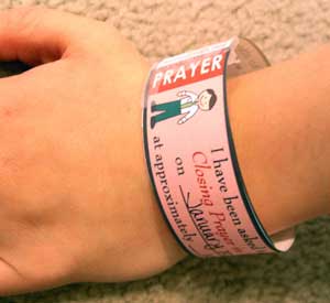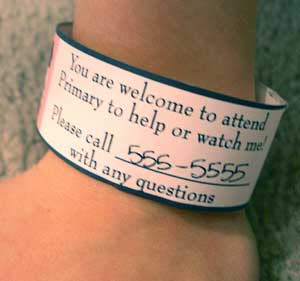 Write the assignment on the wristband and tape it around the child’s arm at Primary like this: