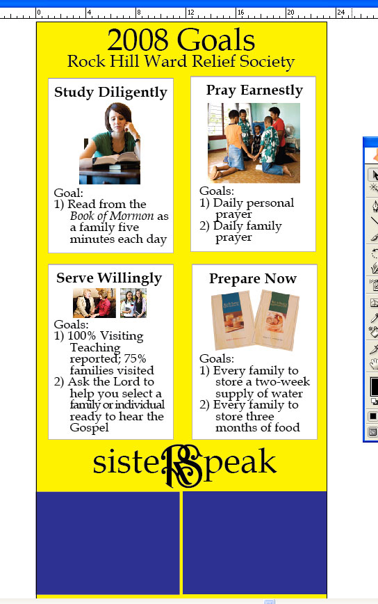 I created this scale version of our Relief Society bulletin board for last year. It had 11×17 inch sheets printed with the picture and information you see on the mockup, mounted on blue paper (not shown), along with the text you see. At the bottom were two folders to hold extra handouts. The background was yellow bulletin board paper to keep with the blue and gold RS theme. We had used President Monson’s challenge to women to serve diligently, serve willingly, and pray earnestly as our theme. We added “prepare now” and used each of the 4 topics as themes for our quarterly Enrichment activities.