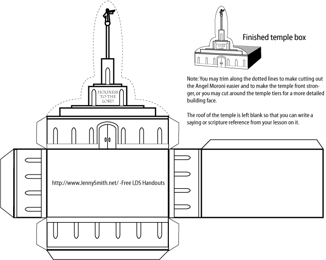 Jennifer H. says, “For YW Manual 2 Lesson 15, I used the temple box found on your website. I printed it out on velum paper which made it a little more special than plain white paper. At the end of the lesson, I passed out the uncut boxes and scissors. I had each girl turn it upside down and write “I Will Prepare” on the roof (when folded it will end up right side up). Then we cut them out and folded them together. It made for a fun visual handout, and carried a commitment from each girl.”