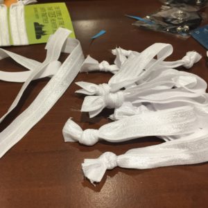 Cut the elastic to 9 inch lengths. You can make 20 cards (40 temple hair bands) out of one 10 yard section of fold over elastic. Just tie a knot in the end of the elastic to make the hair bands. This is an activity that your Beehives could do easily.