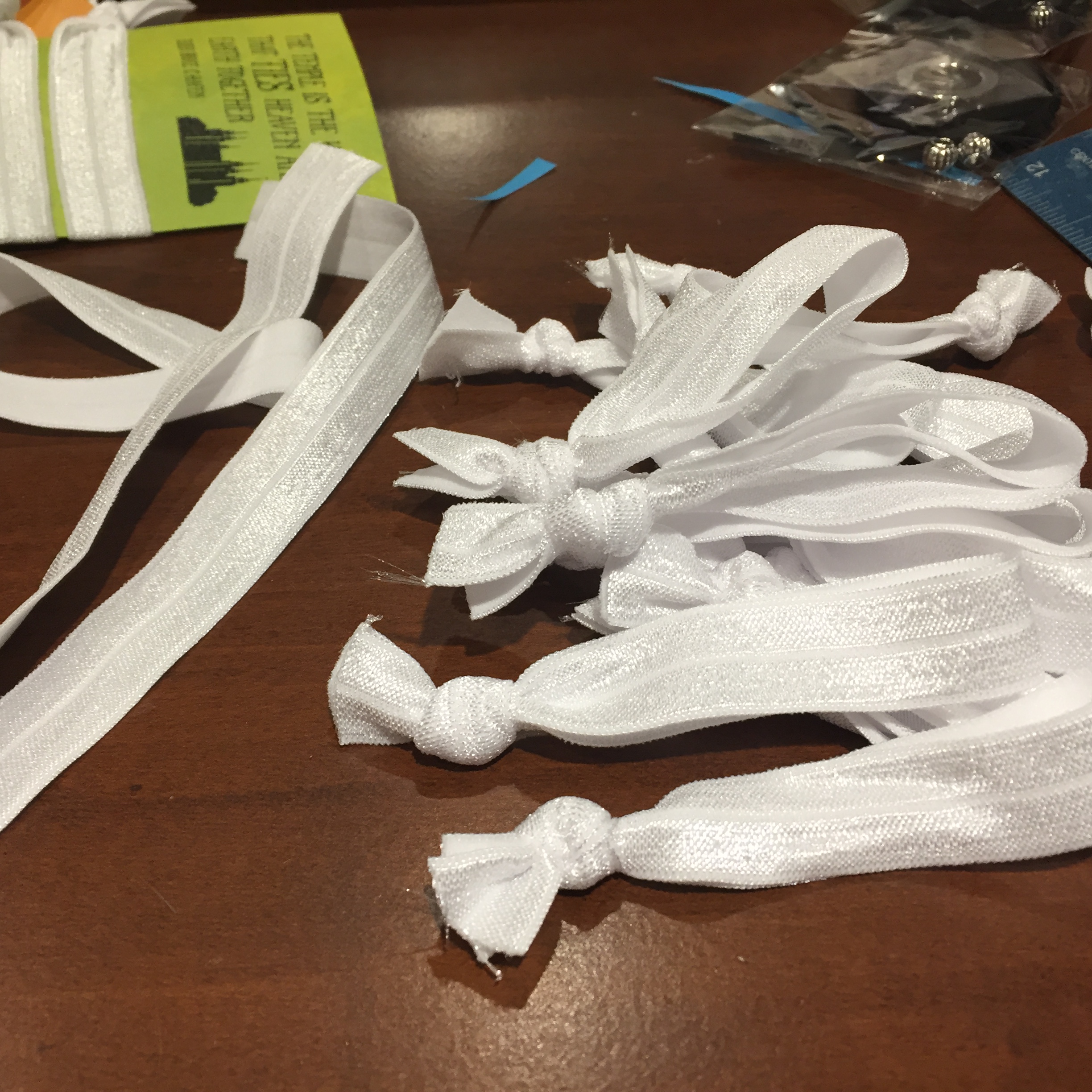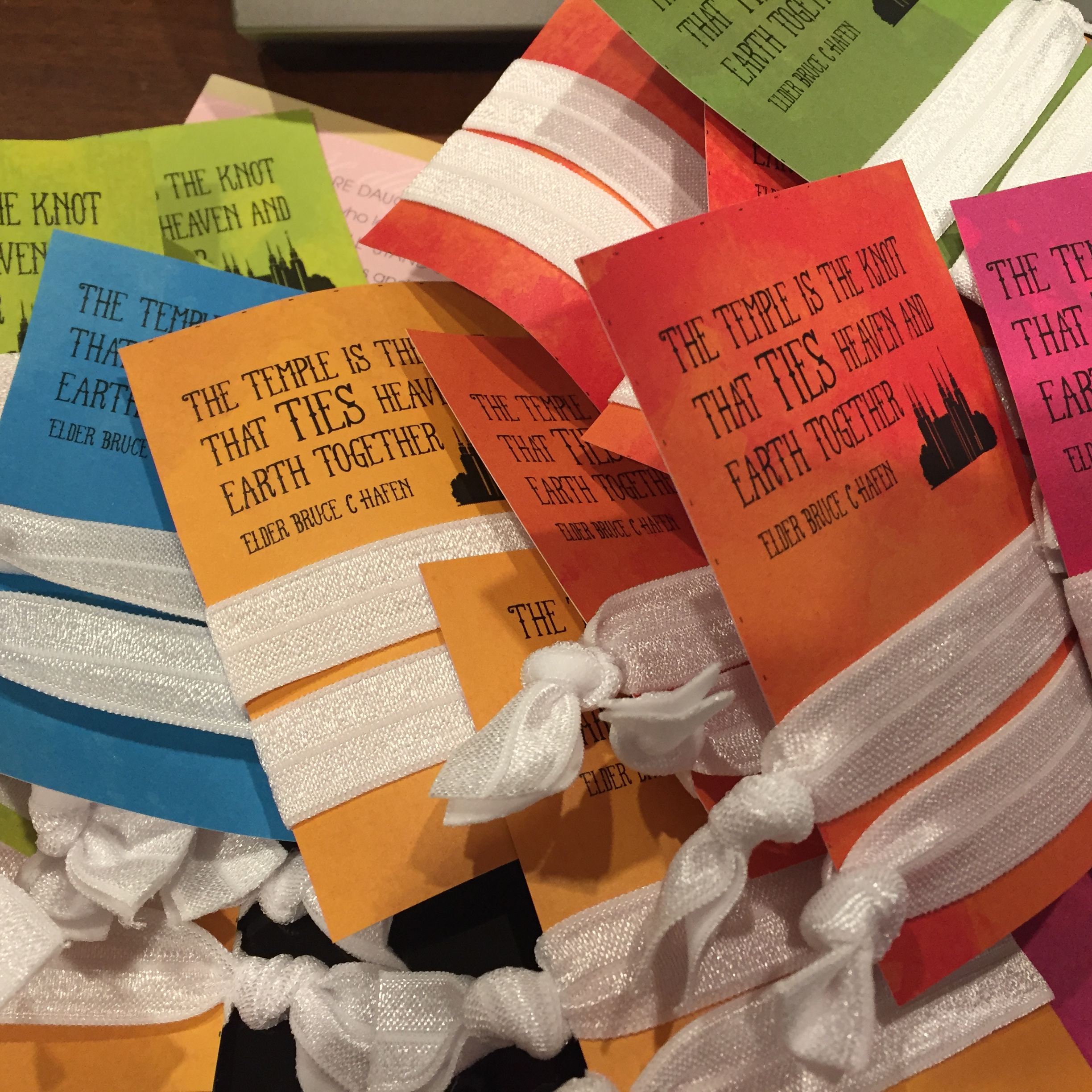 One of the young women counselors saw this cute idea for Temple Hair Ties on a Facebook group and asked me to help her put them together. They turned out fantastically!