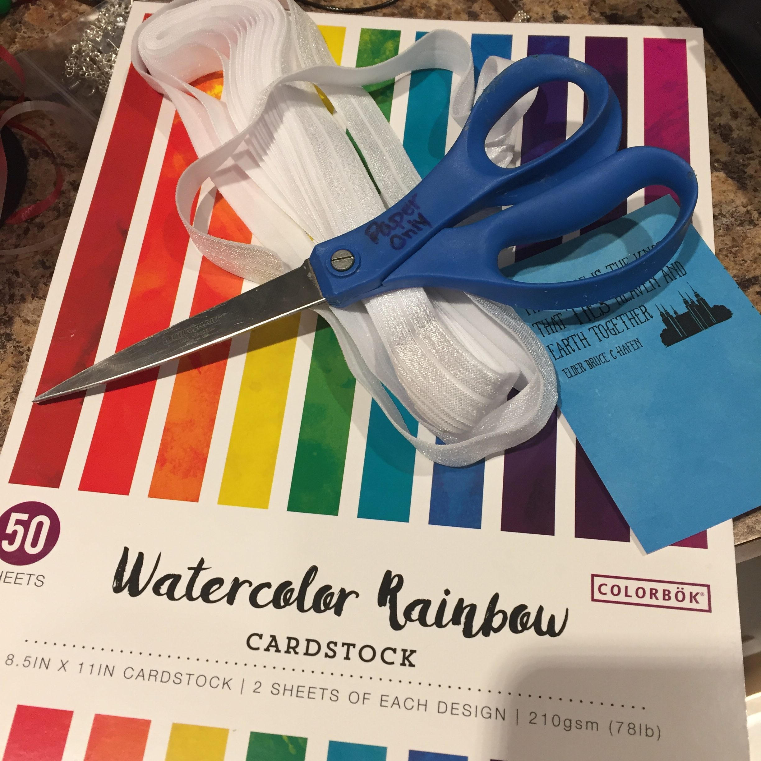 You will need scissors, Fold Over Elastic — I got mine at Amazon, some cardstock — I got this at WalMart, and my printable — available below. The cards measure just over 2.75 inches wide and 4 inches tall. They are sized to make 9 inch hair ties