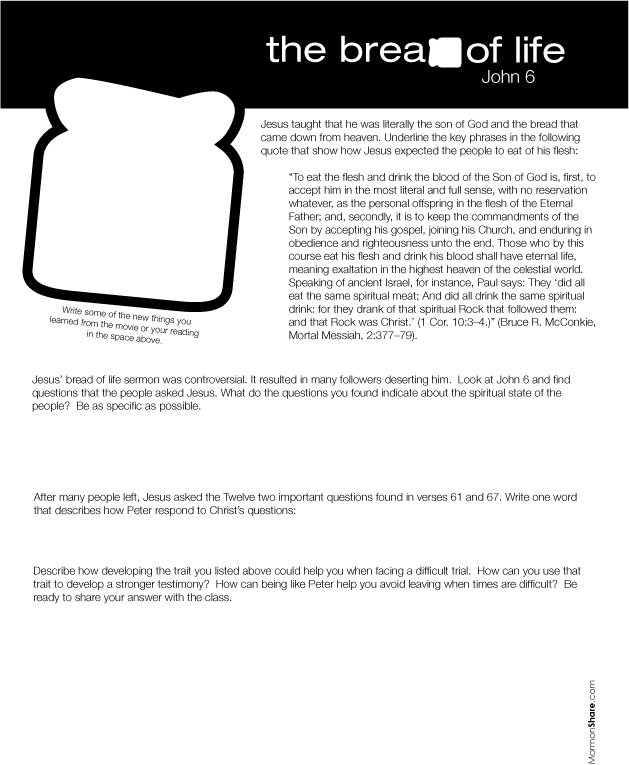 Here is a handout I made to use during our lesson on John 6 tomorrow.  The movie referenced is from BYUTV’s show on the life of Jesus Christ.  I am showing just the part on the bread of life sermon.  Students will watch the movie and write down things new to them or items that they learned from their study the night before.