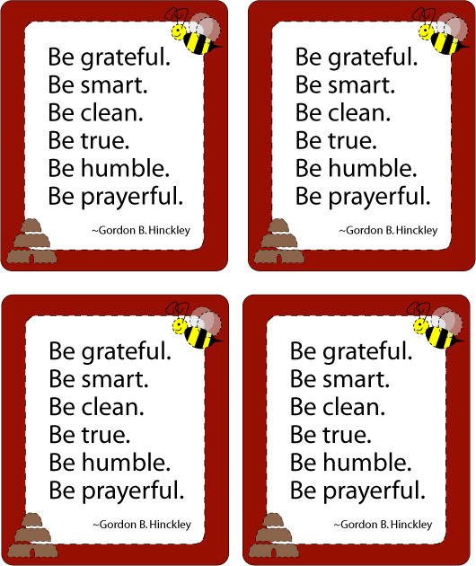 This is a handout I created for a Young Women’s lesson. There are four images per page, full color, with the 6 Be’s, a honey bee, and a hive.