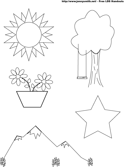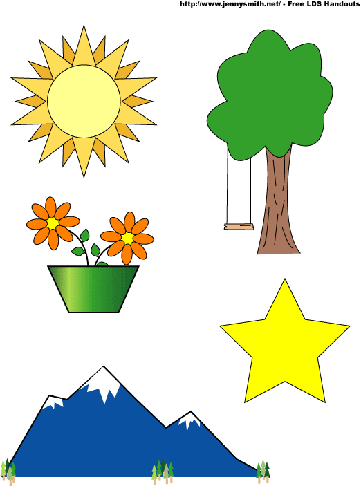 Clip art images include the sun, a tree, flowers, stars, and mountains.