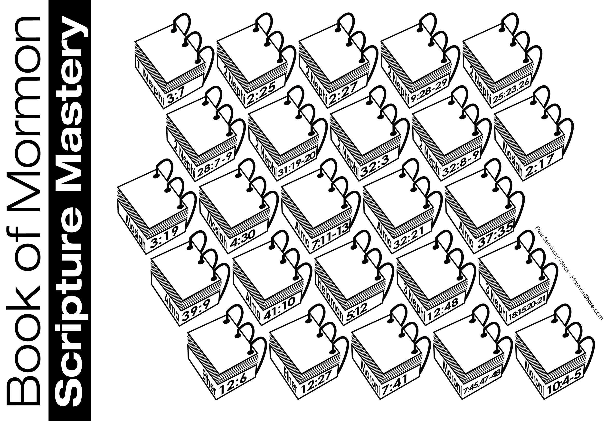 The “universal” part of the Book of Mormon scripture mastery poster means that you don’t have to put any names on the poster.  If you’re like me, it’s just a few weeks until Seminary starts and the Bishop hasn’t given you a class list yet.  With this poster, it doesn’t matter if I end up with 12 or 20 students, I’m all set.