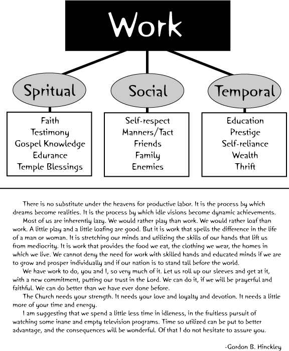 I used this handout when teaching LDS Young Women Manual 1, Lesson 45, The Value of Work, to help the girls to understand 3 types of work. Also has a quote on work from President Gordon B Hinckley.