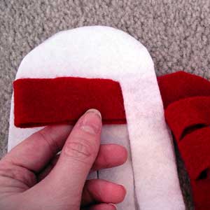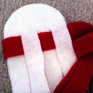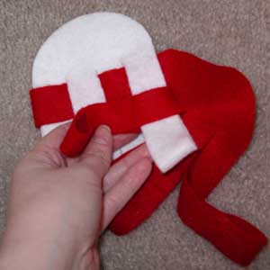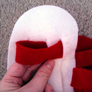Hold one strip folded shut in one hand, and the other strip open with your fingers. Thread the folded strip through the center of the open strip. Work both edges up as high as you can against the beginning of the cut strip.