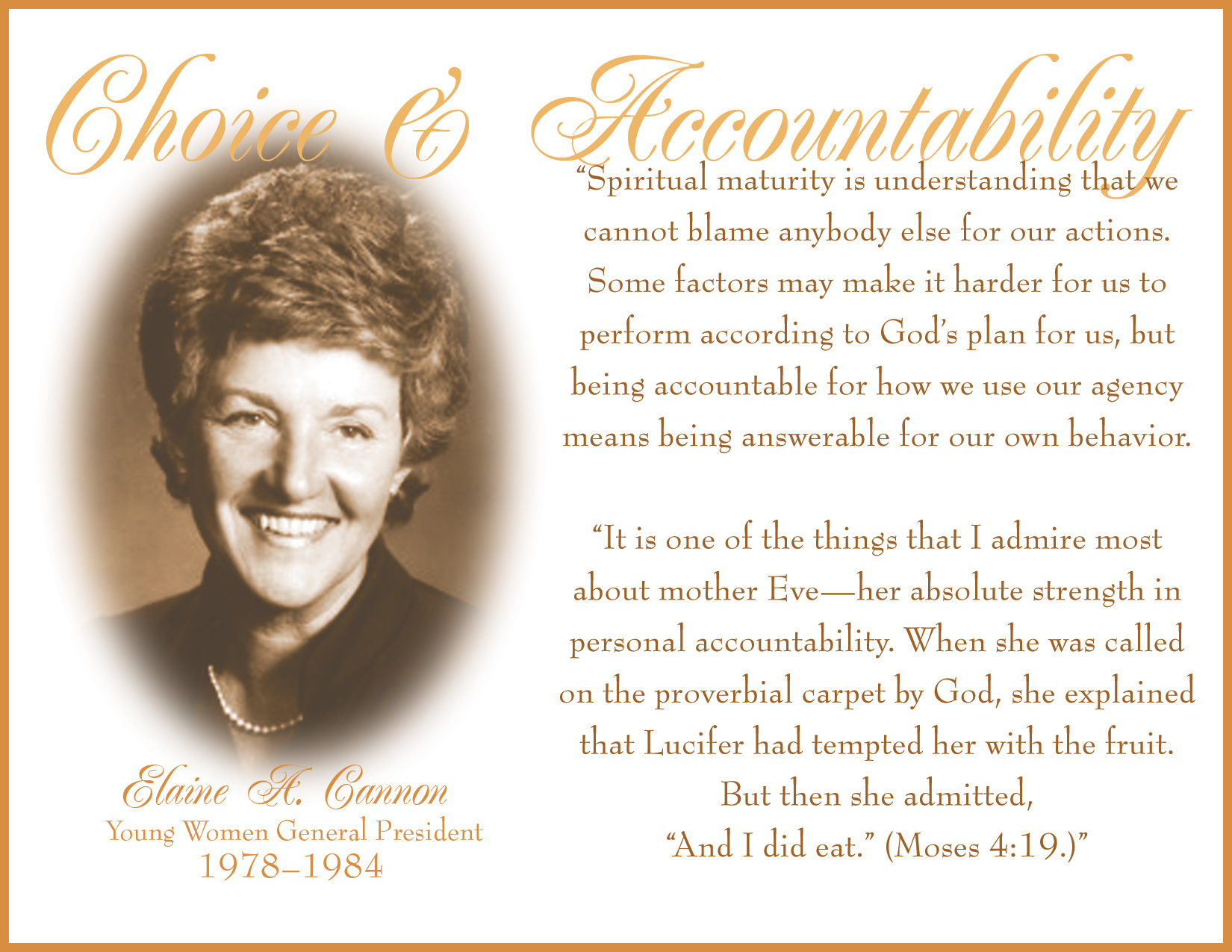 “Spiritual maturity is understanding that we cannot blame anybody else for our actions. Some factors may make it harder for us to perform according to God’s plan for us, but being accountable for how we use our agency means being answerable for our own behavior. It is one of the things that I admire most about mother Eve—her absolute strength in personal accountability. When she was called on the proverbial carpet by God, she explained that Lucifer had tempted her with the fruit. But then she admitted, “And I did eat.” (Moses 4:19.)”
