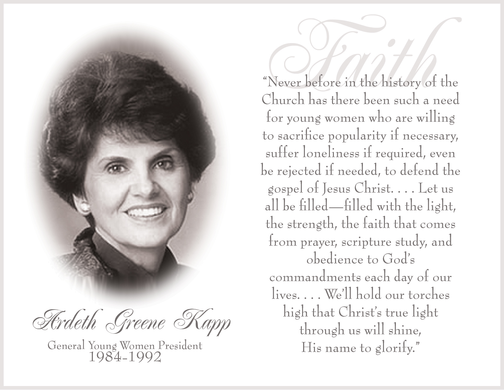 [Perhaps not the obvious quote for faith, but I love the emphasis on obedience. Faith isn’t just wishing — it’s acting. The current YW program is the brain-child of Ardeth Kapp. It brought the young women’s programs light years ahead. No longer were young women practicing our chewing {seriously}, but young women could focus on true Personal Progress. Love her.]