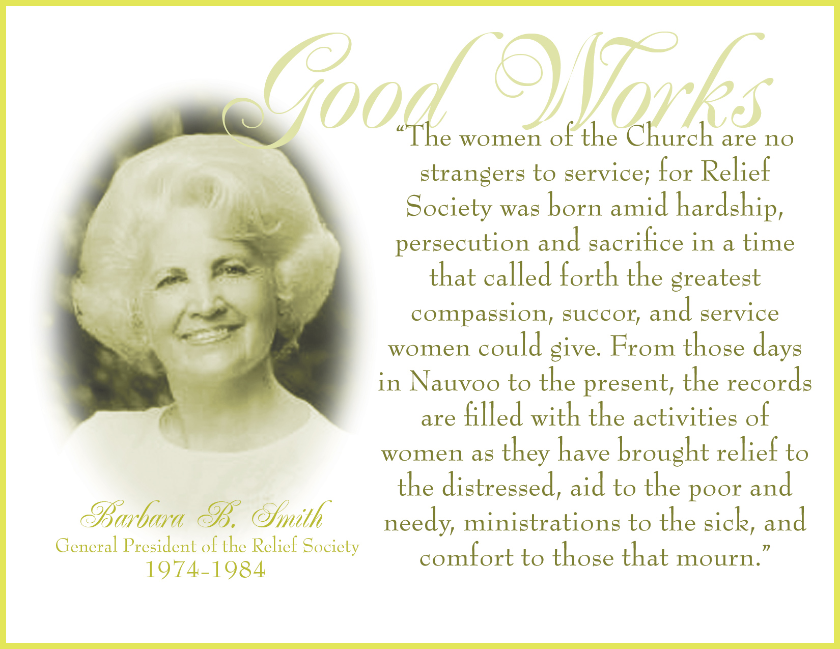 “The women of the Church are no strangers to service; for Relief Society was born amid hardship, persecution and sacrifice in a time that called forth the greatest compassion, succor, and service women could give. From those days in Nauvoo to the present, the records are filled with the activities of women as they have brought relief to the distressed, aid to the poor and needy, ministrations to the sick, and comfort to those that mourn.”