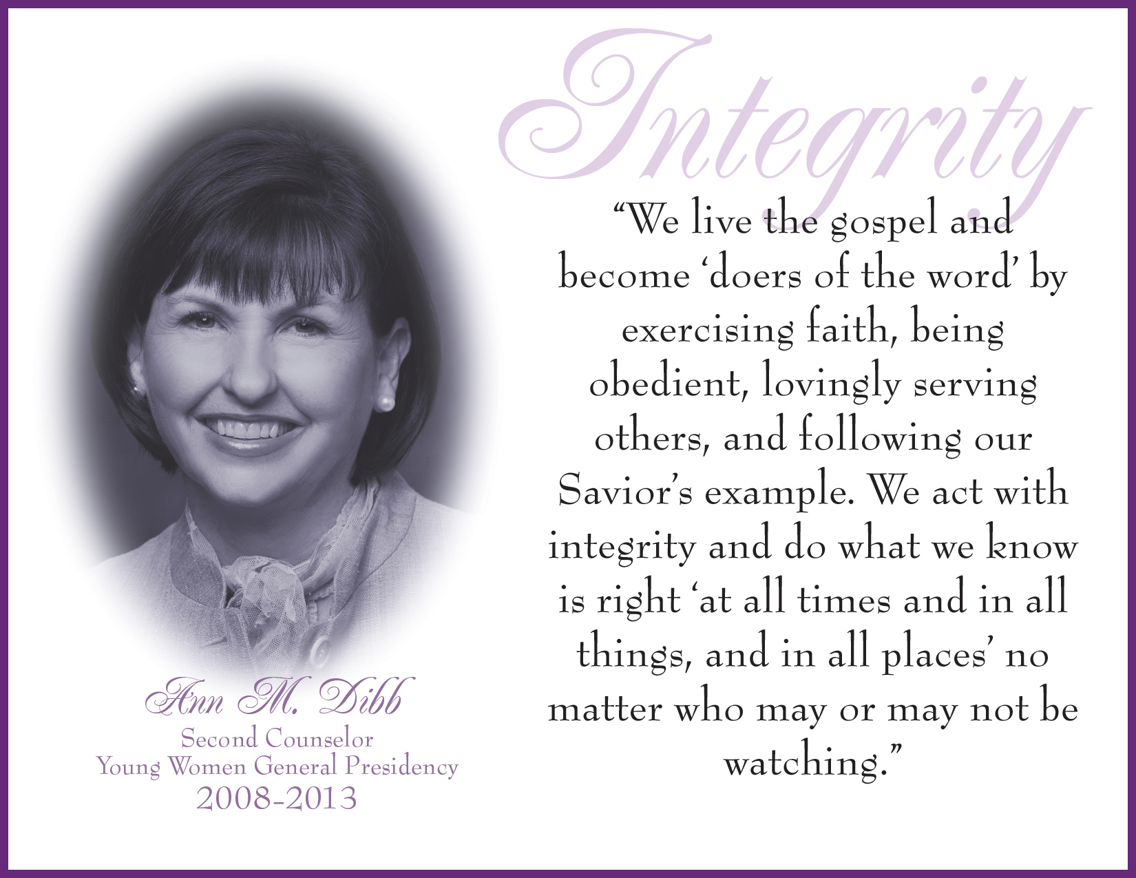 “We live the gospel and become ‘doers of the word’ by exercising faith, being obedient, lovingly serving others, and following our Savior’s example. We act with integrity and do what we know is right ‘at all times and in all things, and in all places’ no matter who may or may not be watching.”