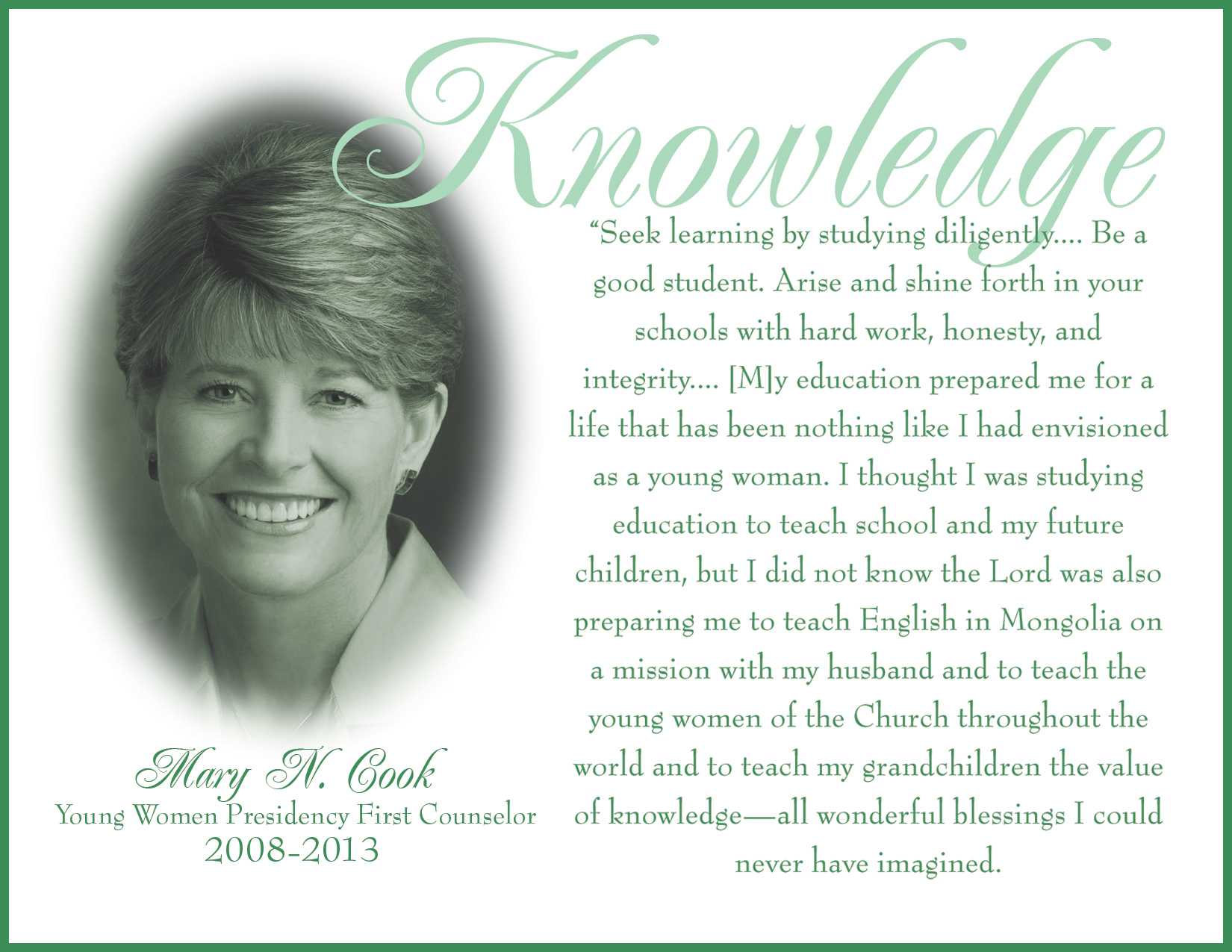 “Seek learning by studying diligently…. Be a good student. Arise and shine forth in your schools with hard work, honesty, and integrity…. [M]y education prepared me for a life that has been nothing like I had envisioned as a young woman. I thought I was studying education to teach school and my future children, but I did not know the Lord was also preparing me to teach English in Mongolia on a mission with my husband and to teach the young women of the Church throughout the world and to teach my grandchildren the value of knowledge—all wonderful blessings I could never have imagined.”