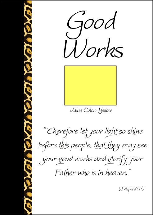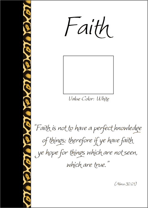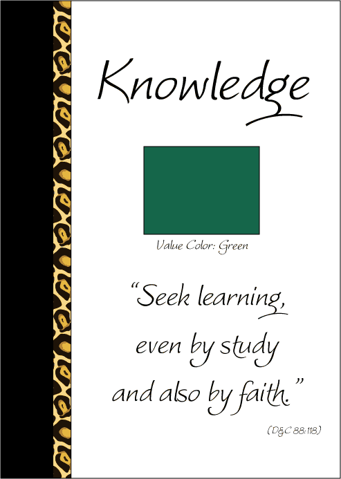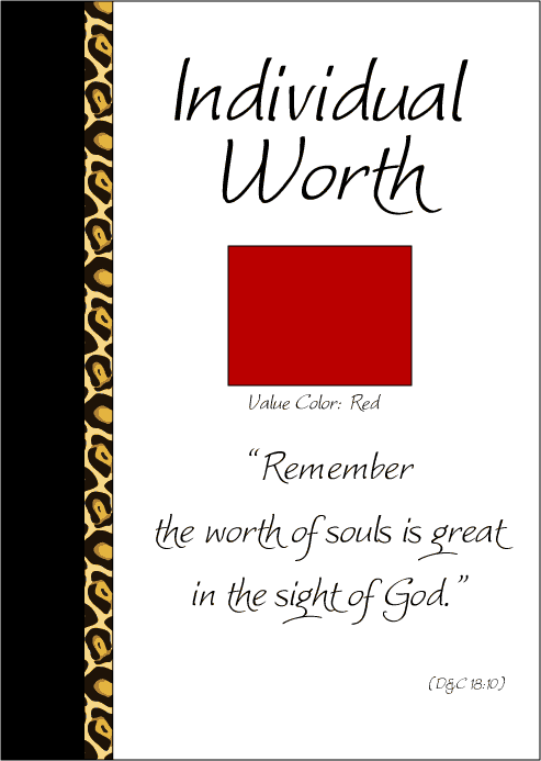 This is one in a series of 8 1/2″ x 11″ signs for the LDS Young Women’s Personal Progress program. Each sign has the value name, color, and scripture.