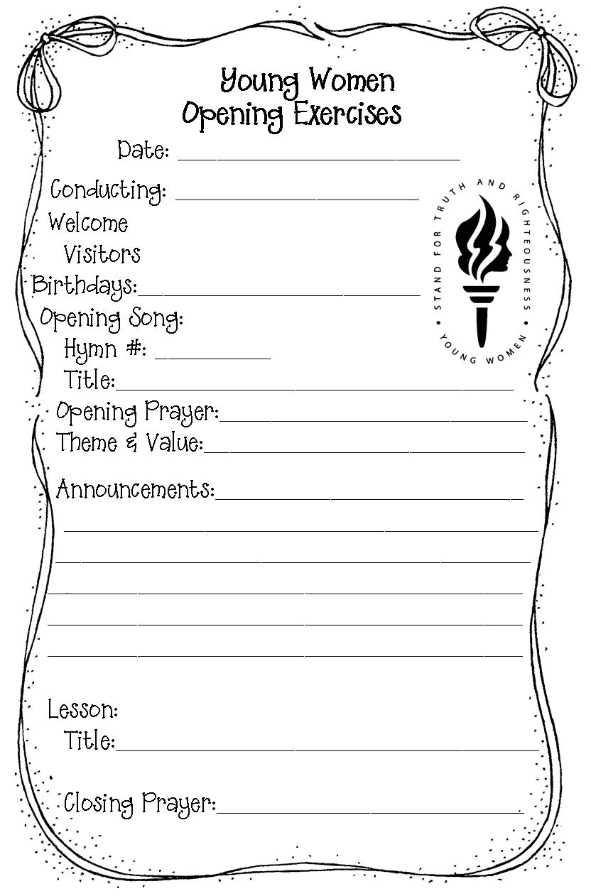 Jill H. shared the agenda form her Young Women’s class uses. She says, “I created this because we didn’t need to dedicate a whole sheet of paper to an opening exercises agenda. This works better for us.”