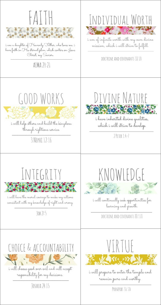 As of late, I have become ga ga for vintage floral patterns. There is something just pretty and sweet about them. I decided to create the YW values with pretty florals. I plan on printing them off (enlarged copies) and posting them in the YW room for decoration. Feel free to use in your young womens and share! You can download for free here http://courtneyaitken.blogspot.com/2013/01/yw-values-vintage-style.html