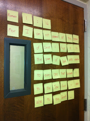This great idea comes from Shauna at http://seminaryatsixam.blogspot.com/ As students arrive, each seat has 2-3 post-it notes with a word, number, or punctuation mark. When I tell them to go, they must work as a group to get their words in order to make a scripture mastery scripture. Until they see who has the name of the book and some of the numbers, they generally have no idea which scripture…