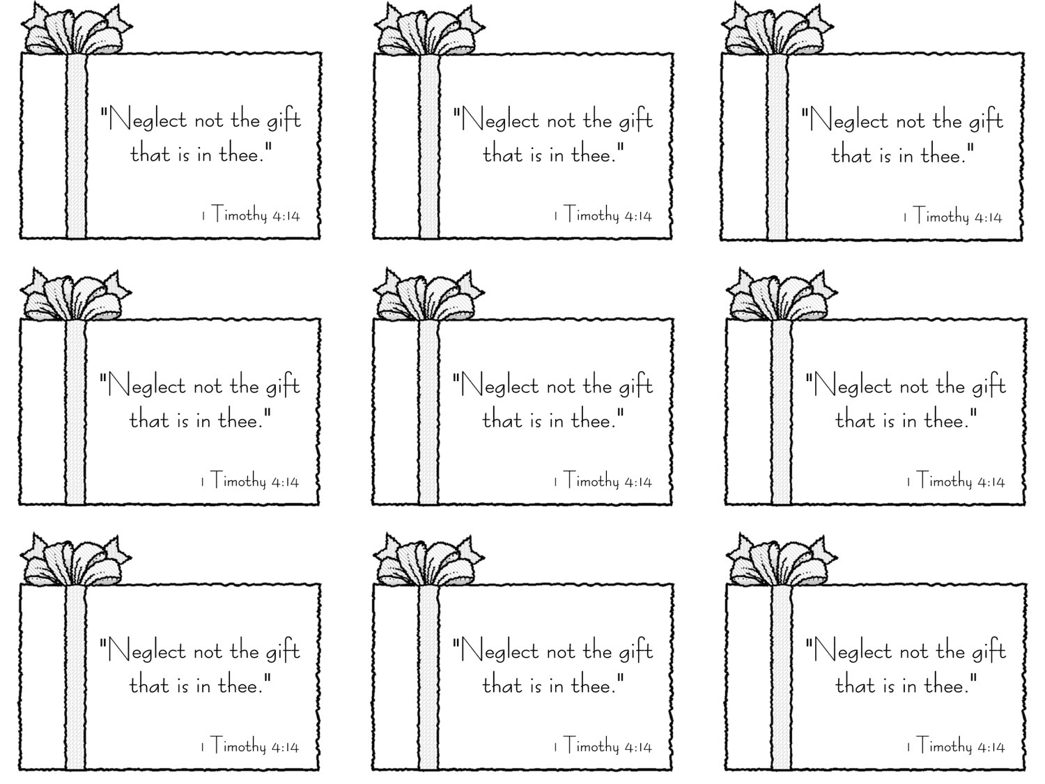 Julie M shared this cute handout with the scripture from 1 Timothy 4:14 on it. 9 per page, 8.5×11 inches, black and white.