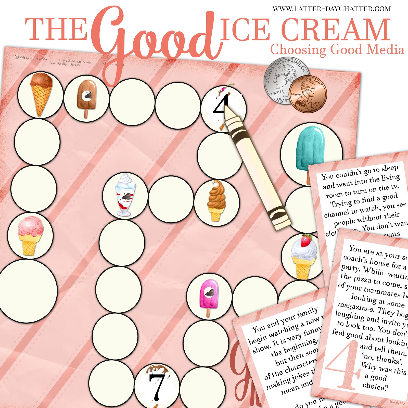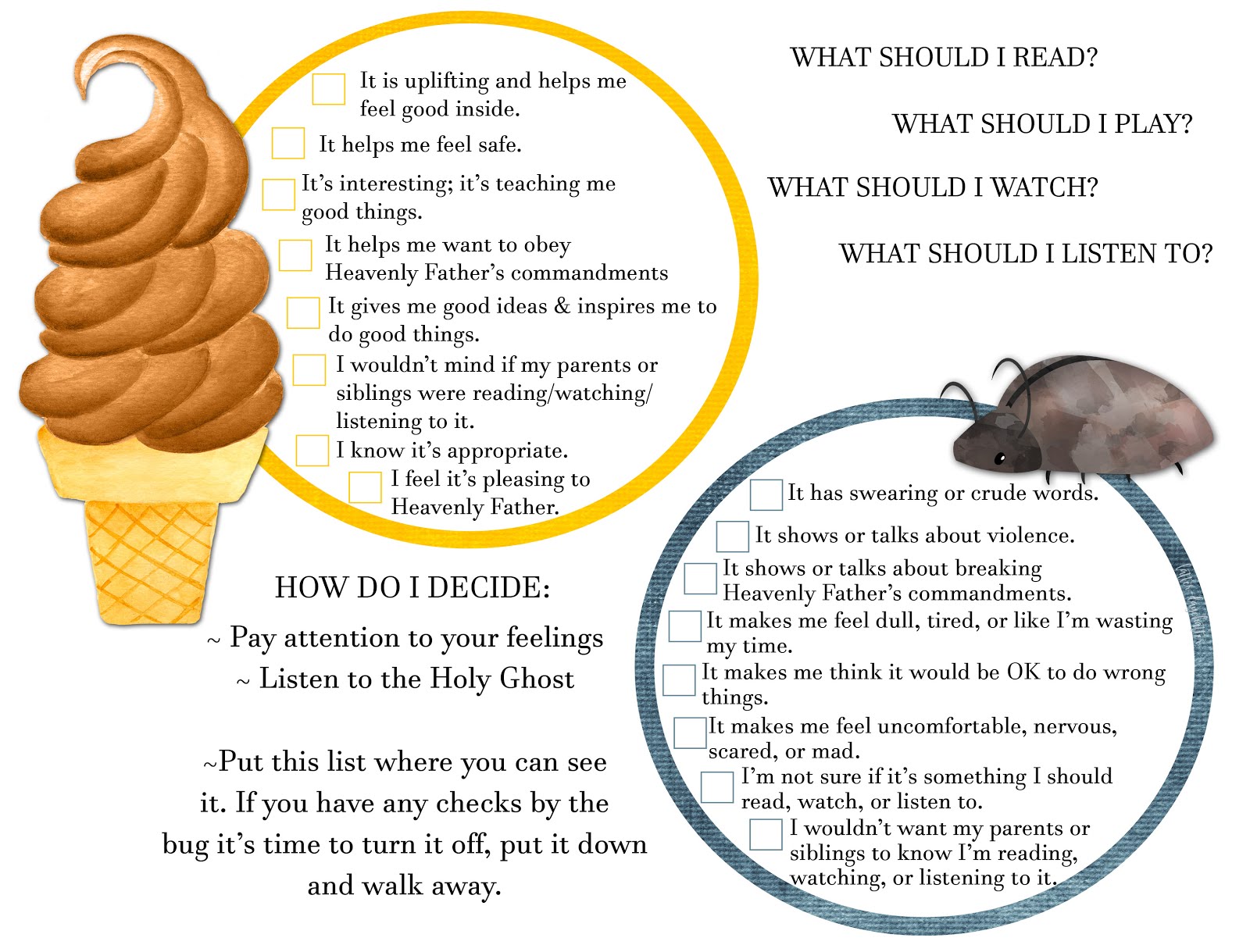 This handout — in my opinion- is worth to print for each child or family to 1) remember the lesson 2) have something tangible to decide what is good/bad. Everything on this handout word-wise has been taken from THIS Friend article, I just wanted to make it more towards the game with the ice cream and be more friendly to the printer.