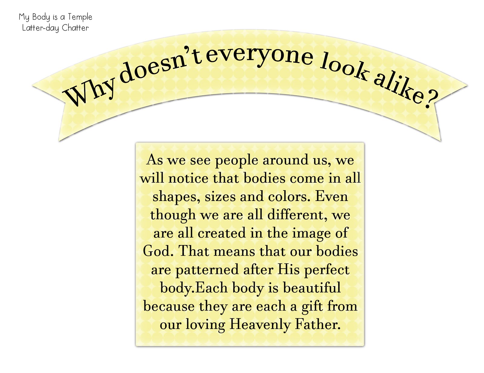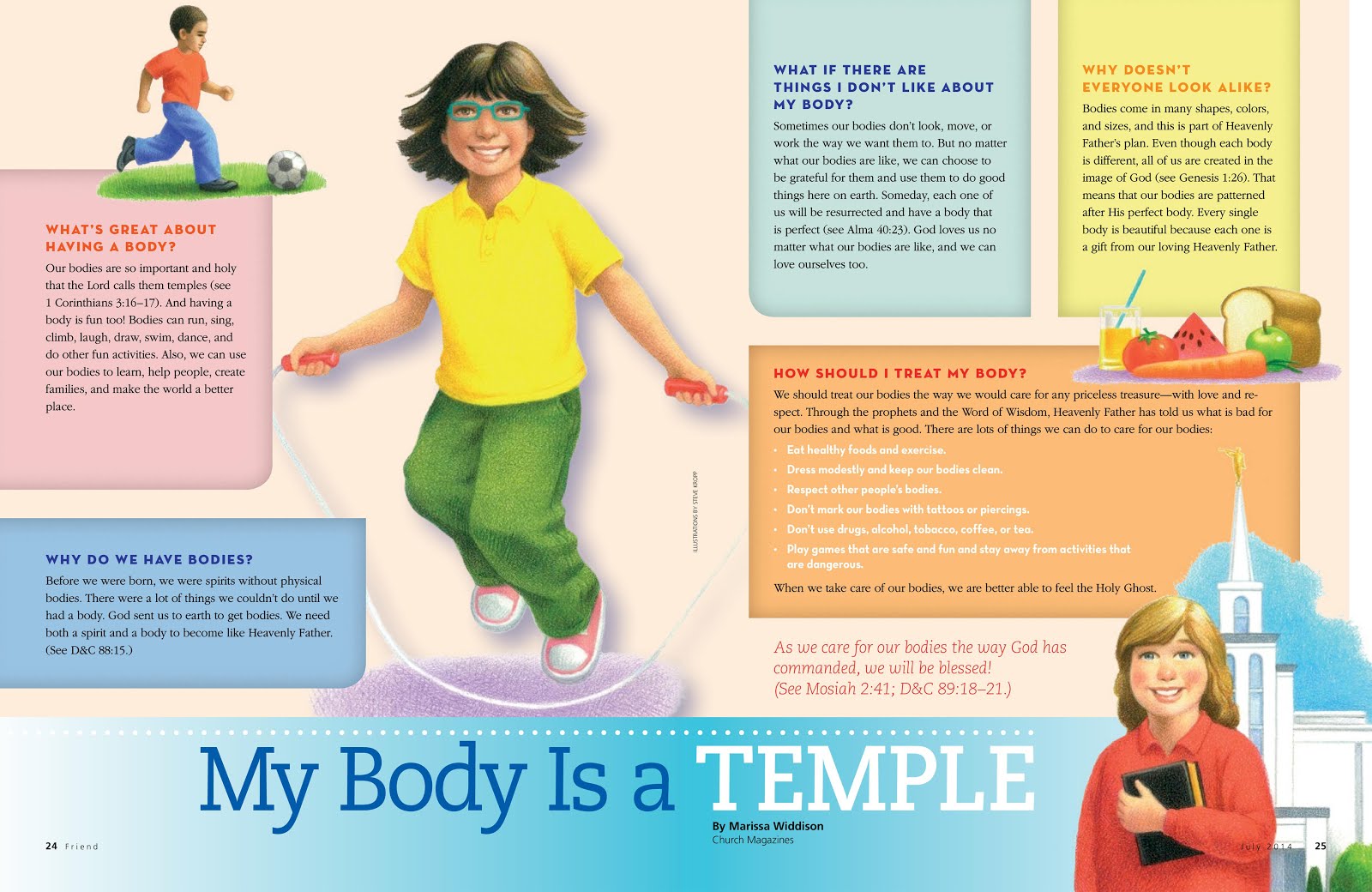 I have also included some illustrations from different Friend magazines about some things we can do with our bodies. You can put these up with the temple pictures from the “Introduce the doctrine” and ask the kids how are our bodies the same as temples?