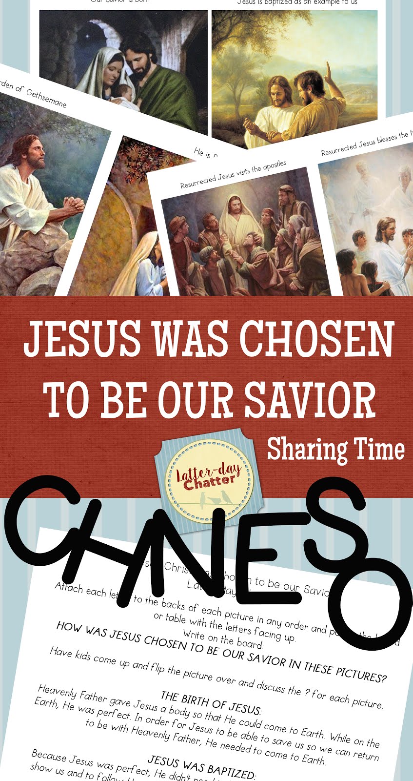 Introduce the doctrine: Write on the board “Jesus Christ was ______ to be our Savior.” Have the letters c, h, o, s, e, and n scattered around the room. Let the children unscramble the letters to complete the sentence. Ask them to read Moses 4:2 to check their answer. Read the statement on the board together.