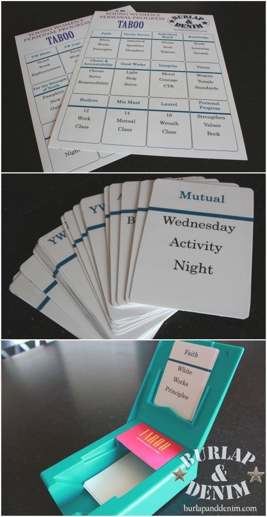 Free printable Young Women Personal Progress TABOO game. Perfect for New Beginnings, class lessons, class activities, or rainy day camp activity. Directions and Download HERE: http://burlapanddenim.com/2012/03/new-beginnings-game-night/