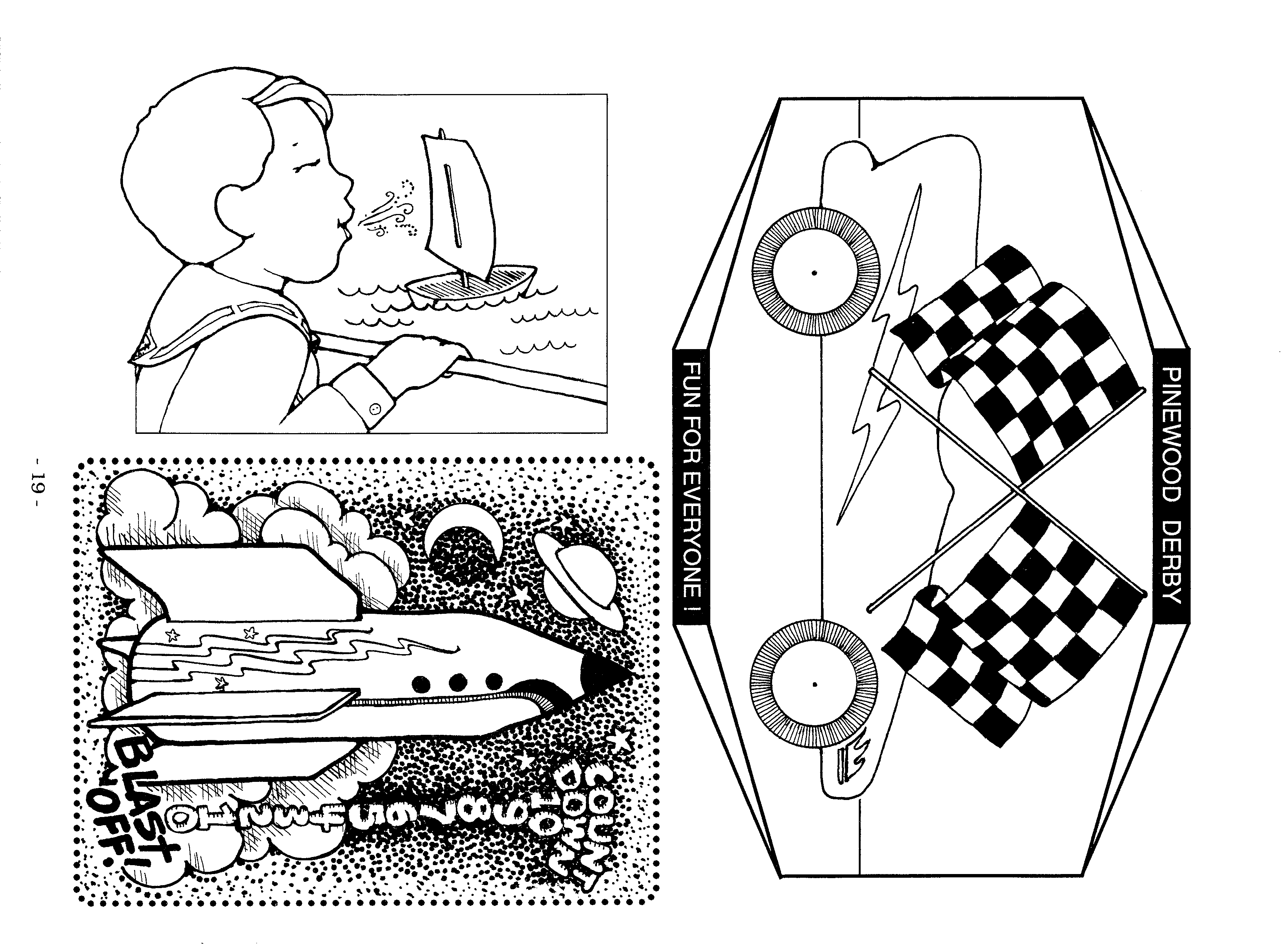 This black and white image, Cubs Page 19, was donated by the artist, Chris Gunn. Click to read more about Chris. This page includes graphics for the Pinewood Derby, Raingutter Regatta and Space Derby