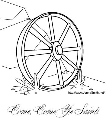 This is LDS program cover art with a wagon wheel and the title of the pioneer song “Come Come Ye Saints”. Black and white. The PDF version of this file is already laid out for printing (image on the right side).