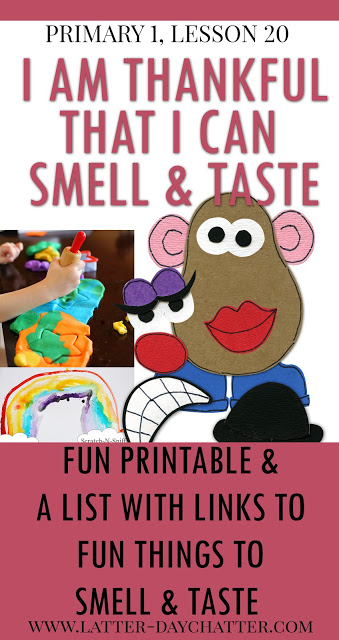 LDS.org Primary 1, Lesson 20: I am Thankful that I can Smell and TasteSmell:Make some Scratch n’ Sniff Paint and create a masterpiece!Create some Scent Jars and bring in to share smells!Raid your spice cupboard and bring in different spices to smell.Ta…