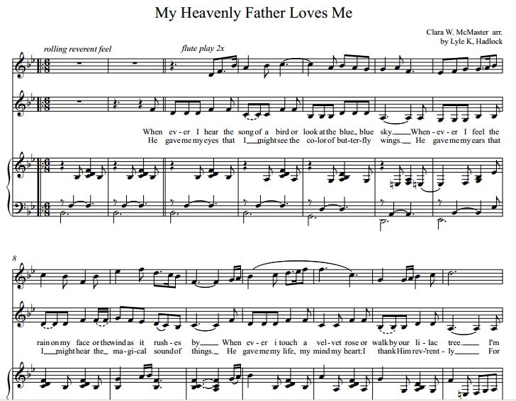 Downloaded from: http://singingasongisfun2do.blogspot.com/2013/01/my-heavenly-father-loves-me.html click here to downloadA few years ago I came across this beautiful arrangement of My Heavenly Father Loves Me by Lyle Hadlock. He composes and arranges beautiful music, check out his website. This arrangement is for vocal, piano and flute and it’s simple enough that the kids won’t be confused. I love the key change and the ending, simple and perfect. And it’s free. Thank you Lyle Hadlock!When I’ve taught this song…