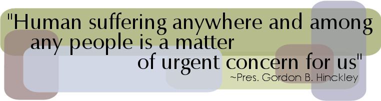 Another great one from Trudy! This is a quote from Gordon B. Hinckley that reads: “Human suffering anywhere and among any people is a matter of urgent concern for us.” (“News of the Church,” Ensign, June 2000, 71)