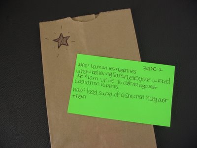 So I then had one student at a time read a point from the outline on their index card. I let them know this is a global view of why 3 Nephi is so important – in essence, a microcosm of the entire Book of Mormon. And I explained that we today were going to prepare our “spiritual feast sacks” for our study of 3 Nephi (they still don’t know exactly what they will be doing with the sacks, though, during the next month).