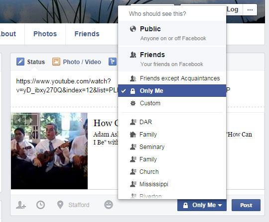 It’s always best to download videos before using them in class to cut out at least one level of possible technical things that can go wrong during your lesson. If, however, you’re like me and sometimes get texts during Sacrament meeting asking you to sub, you may need to use the Facebook method to show a video. In short, you’re going to post the video to your wall but set the video to “Only Me”, so that your students won’t see it before class.