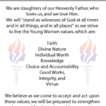 WE ARE DAUGHTERS of our Heavenly Father, who loves us, and we love Him. WE WILL “STAND as witnesses of God at all times and in all things, and in all places” (Mosiah 18:9) as we strive to live the Young Women values, which are